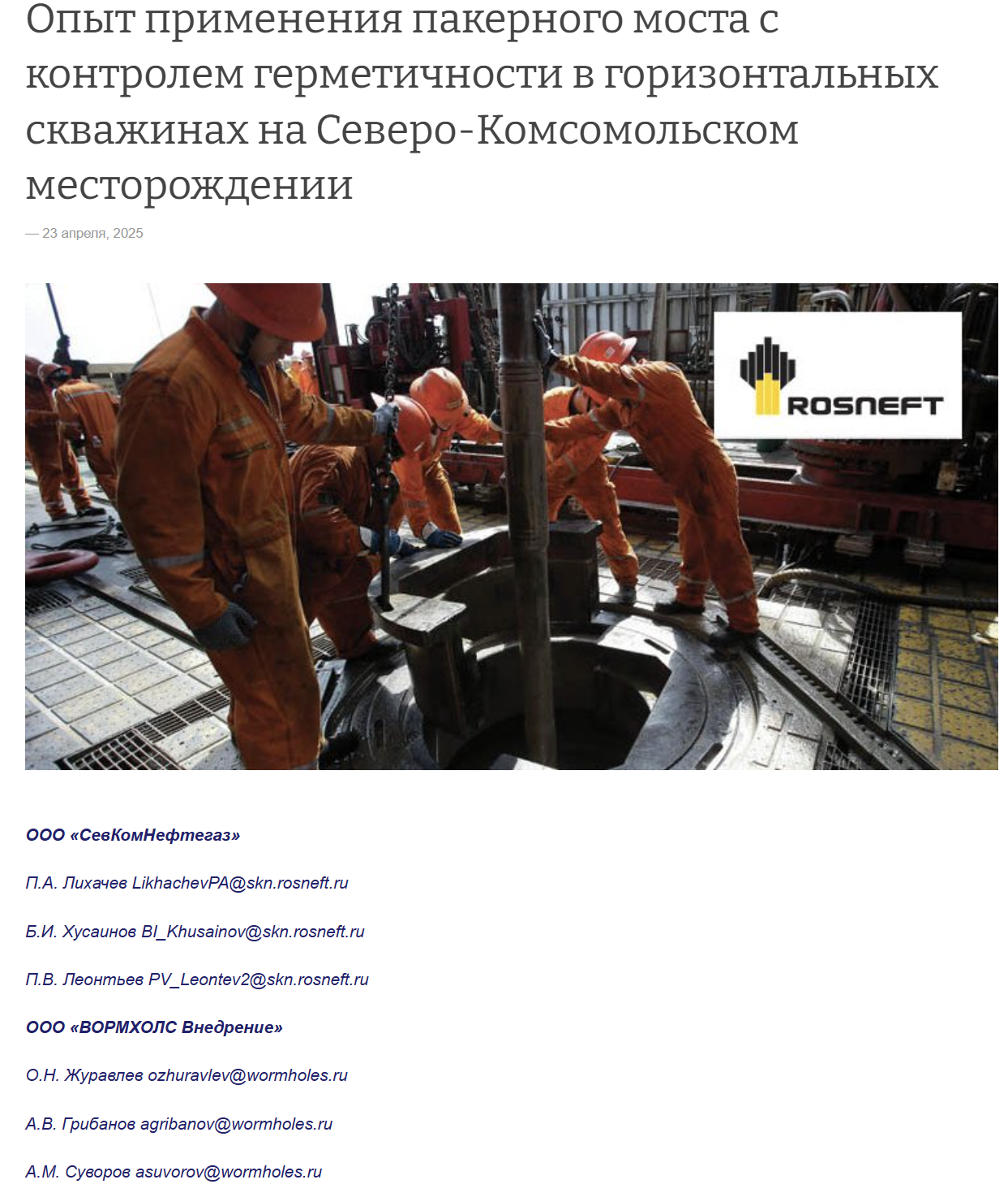 - Малый и средний бизнес может поднять КПД скважин до 400%, Журавлев О. Н., март 2023, Нефтегазовая вертикаль - Применение систем мониторинга герметичности на Самотлорском месторождении, Зотов Е. Н. Баюнов С. В., Журавлев О. Н., Грибанов А. В., Суворов А.М., ноябрь 2024, Нефтегазовая вертикаль - Применение маркерных систем определения профиля притока на Самотлорском месторождении Зотов Е. Н. Баюнов С. В., Журавлев О. Н., Грибанов А. В., Суворов А.М., март 2025, Нефтегазовая вертикаль - Применение извлекаемой системы поинтервального мониторинга притока на Северо-Комсомольском месторождении, П.А. Лихачев, Б.И. Хусаинов, П.В. Леонтьев, О.Н. Журавлев, А.В. Грибанов, А.М. Суворов, апрель 2025, Нефтегазовая вертикаль - Влияние герметичности интервалов на эффективность работы многостадийного гидроразрыва пласта, А.Ю. Тропин, А.В. Фадеев, О.Н. Журавлев, А.М. Суворов, февраль 2025, Нефтегазовая вертикаль - Применение фильтров с обратной фазовой проницаемостью в осложненных промысловых условиях, И.А. Усов, Я.А. Лятифов, Т.В. Хисметов, О.Н. Журавлев, А.В. Грибанов, сентябрь 2025, Нефтегазовая вертикаль - Опыт применения пакерного моста с контролем герметичности в горизонтальных скважинах на Северо-Комсомольском месторождении, П.А. Лихачев, Б.И. Хусаинов, П.В. Леонтьев, О.Н. Журавлев, А.В. Грибанов, А.М. Суворов, апрель 2025, Rogtec - Опыт применения мобильной установки мониторинга профиля притока, П.А. Лихачев, Б.И. Хусаинов, П.В. Леонтьев, О.Н. Журавлев, А.В. Грибанов, А.М. Суворов, июнь 2025, Rogtec - Применение систем мониторинга герметичности на Самотлорском месторождении, Зотов Е. Н. Баюнов С. В., Журавлев О. Н., Грибанов А. В., Суворов А.М., май 2025, Rogtec - Опыт применения системы мониторинга герметичности пакеров на Унтыгейском месторождении, А.Ю. Тропин, А.В. Фадеев, О.Н. Журавлев, А.В. Грибанов, А.М. Суворов, май 2025, Rogtec - Выбор системы заканчивания скважин для увеличения эффективности выработки контактных запасов Кувакина М., Макаров Ю, Журавлев О., SPE-176525 - Результаты промысловых испытаний нового поколения устройств контроля притока для ограничения расхода газа в нефтедобывающих скважинах, С.В. Делия, М.В. Чертенков, А.В. Жаковщиков, В.В. Мацашик, О.Н. Журавлев, Р.В. Щелушкин, SPE-178417 - Modeling of completion installation that meets modern conditions of work performance, Zhuravlev Oleg, Shchelushkin Roman, Shadsky Alexey, Prokopcev Roman, SPE-176556